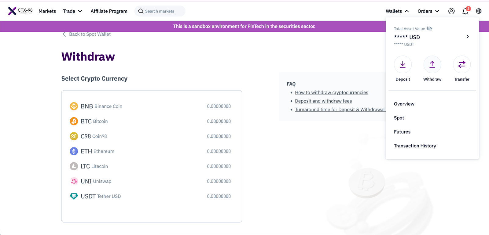 3. Choose the currency where you want to withdraw funds > Select an option from the dropdown menu > Select "Currency"